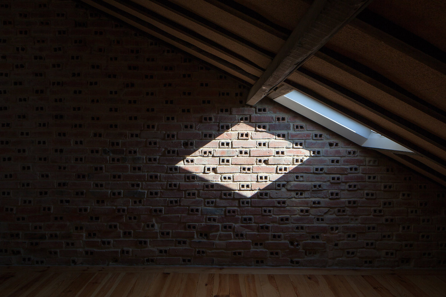 A filmmaker, gave us the task to turn the whole volume into a living and work space, on an extremely low budget. The program expands to two levels, opening up the existing hidden attic. It reorganises "servant" and "served" spaces as positive and negative volumes, creating both continuity and rupture with the pre-existing. Through considered design, use of materiality, colour and natural light, the “servant” spaces acquire autonomous specificities and character. The resulting negative volume, or void, allows the “served” spaces to be open and continuous. With the subtraction of the North ceiling and the addition of skylights on the roof, direct and indirect sunlight, including south-facing light, can now flood the space.The economy of means, through a pragmatic, uncompromising and crude use of materials, is assumed as a scenographic composition.