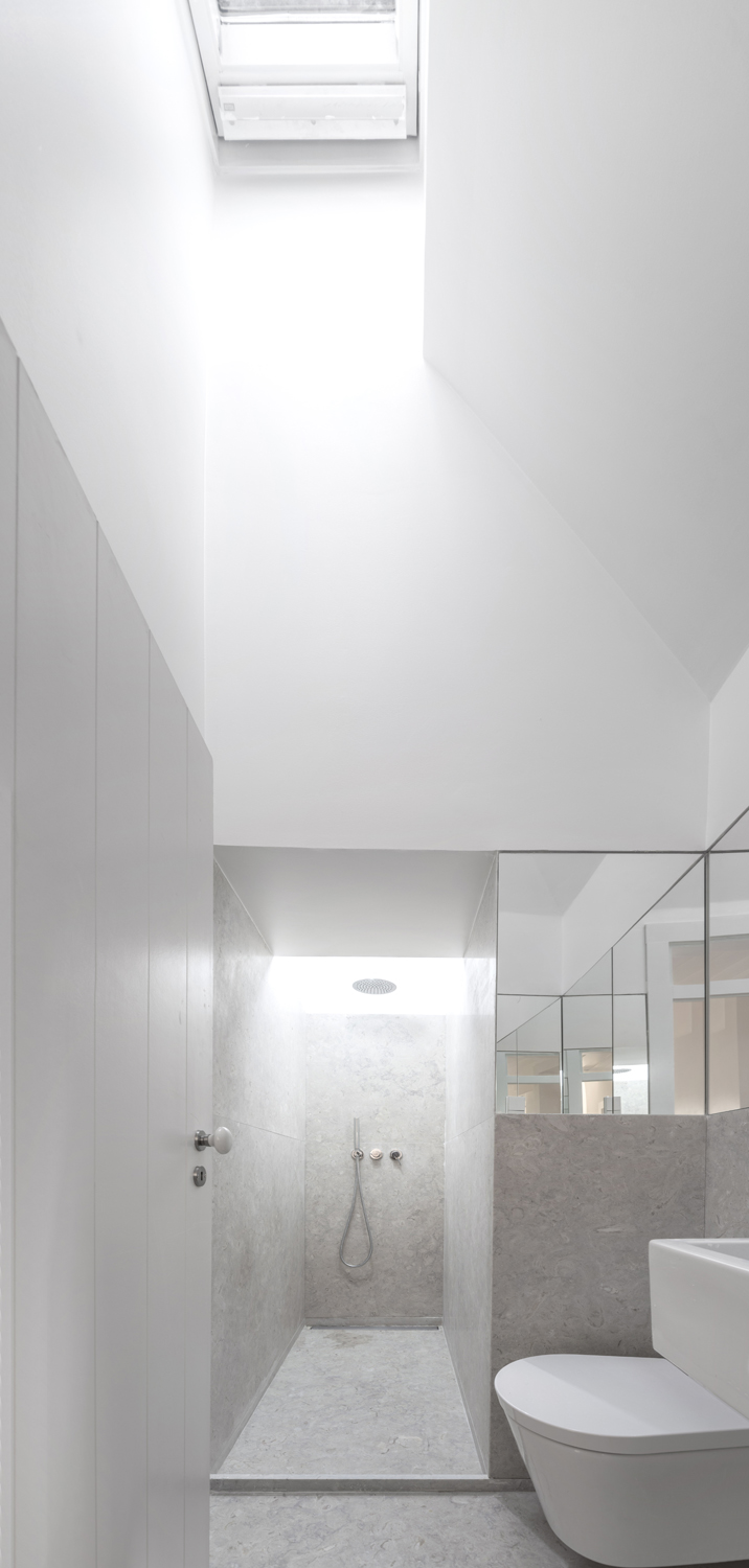 This mansard flat is located at the top of the steep narrow Rua do Vale, which links Rua dos Poiais de São Bento to Largo de Jesus. The building is characterised by its classic language and constructive system, known as "gaiola" (an internal wooden cage filled up with masonry) of five floors plus the attic. From the last storeys one can see the square and the 18th century façade of Nossa Senhora de Jesus Church to the north, the hill of Santa Catarina to the east, and the Tagus to the south. The unit, which has about 50 sq.m. of floor space, had five minuscule juxtaposed rooms, a small unused attic, and a minuscule kitchen and bathroom. The interior was characterised by what was left of the richness of its carpentry work: the tongue and batten ceilings, the doors and respective door frames and hardware, the window frames,the wood dividing walls and the plank wood flooring. The aim of the intervention was to readapt the exiguous juxtaposed rooms, taking advantage of the views and the subtle natural light, enhanced by the existing windows and and by those proposed with surgical precision, producing a continuity with the pre-existing constructive system and language. The kitchen remained in its original location but was enlarged to assume its usual position as a central and distribution area. From the kitchen one can reach all other spaces, whose functions have not been attributed, respecting the programmatic instability of this kind of typologies. The result is a language that creates an ambivalent space where the differences between the notions of existing heritage and the assertion of contemporaneity cohabit, but are also subtly softened.